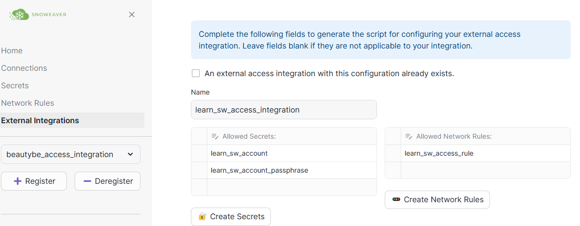 Name: learn_sw_access_integration Allowed Secrets: learn_sw_account learn_sw_account_passphrase Allowed Network Rules: learn_sw_access_rule