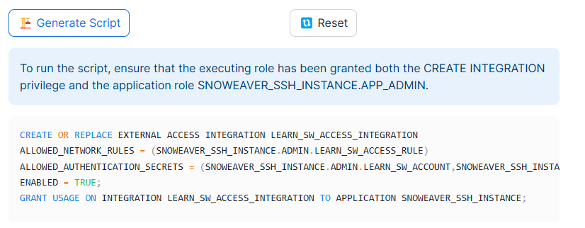 Click Generate Script to create an SQL script for creating a new External Access Integration and granting Snoweaver the necessary access permissions.