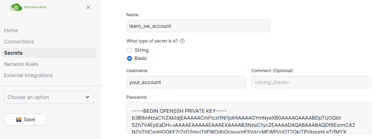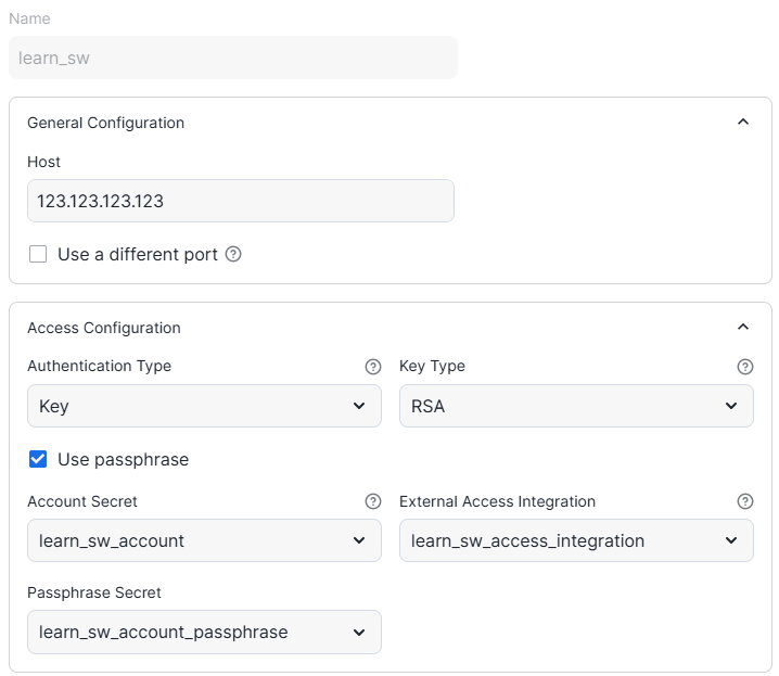 Name: learn_sw Host: <address of your SSH server> Port: (Optional) <SSH port if it is not 22> Authentication Type: <Password or Key> Key Type: <Password or Key> Account Secret: learn_sw_account External Access Integration: learn_sw_access_integration Passphrase Secret: (Optional) learn_sw_account_passphrase