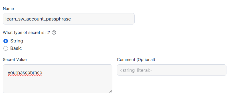Name: learn_sw_account_passphrase Secret Type: String Secret Value: <your passphrase>
